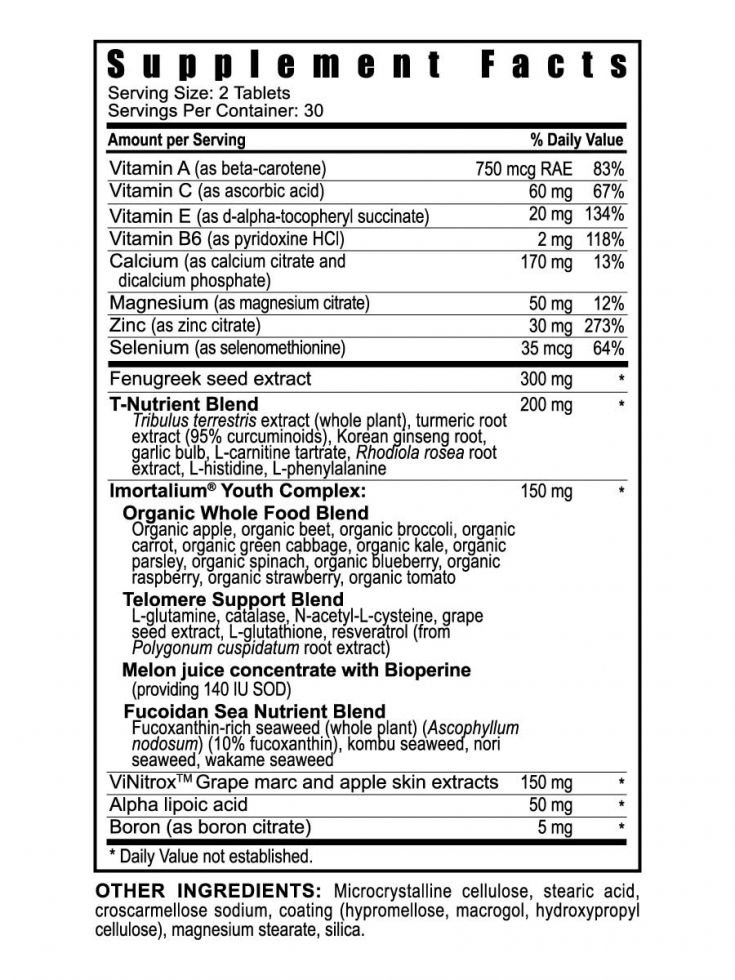 Vitamin A, Vitamin C, Vitamin E, Vitamin B6, Magnesium, Zinc, Selenium, Furan-T™, T- Nutrient Blend, Tribulus terrestris, Turmeric, Garlic Extract, Glycine propionyl-L-Carnitine, Rhodiola Rosea Extract, L Histidine, L-Phenylalanine Imortalium® Youth Complex, Trans Resveratrol, Full Spectrum Whole Food Blend from Grape Seed Extract, Wild Blueberry, Quercetin, Resveratrol, Wild Bilberry, Cranberry, Tart Cherry, Prune, Raspberry Seed, Strawberry Fucoidan-Rich Algae Blend Fucaceae, Laminaria Brown Algae, Irish Moss, Dulse, Red Seaweed, Spirulina Algae, Bladderwrack, Hijiki, Wakame, Nori, Kombu, Regeneryll™ Brand SOD: Superoxide Dismutase plus Bioperine® Telomere Support Blend L-Glutamine, Catalase, Thione Complex™ (Glutathione, Selenium, N-Acetyl-Cysteine, Grape Seed Extract) Alpha Lipoic Acid